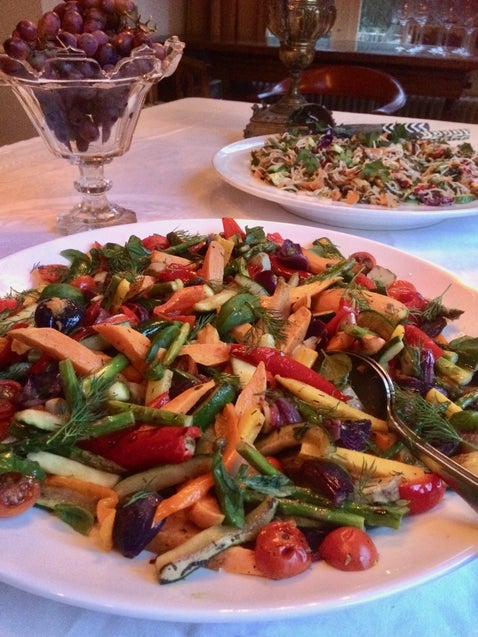 -Salade gegrilde groenten ( bijv. courgette, rode paprika, zoete aardappel, rode ui, groene asperge) met kappertjes-citroen dressing